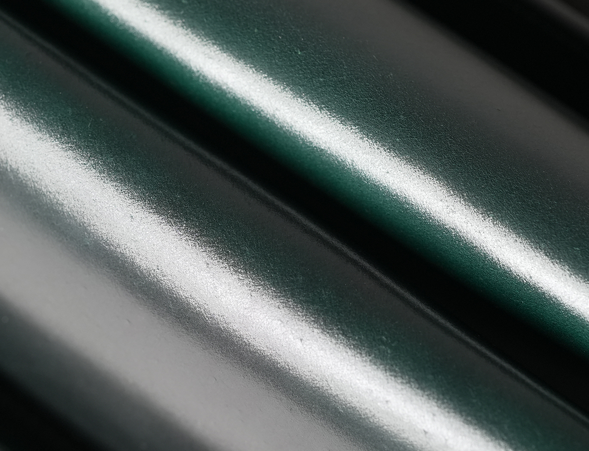 今回のメイン素材は、このシェルコードバンのグリーンを採用しました。シェルコードバンならではの色ムラや独特の艶感を持つ、深みのあるグリーンが特徴です。
