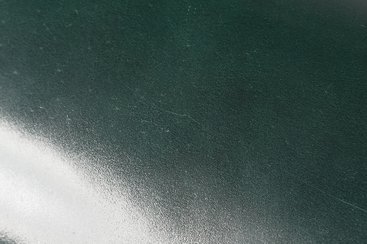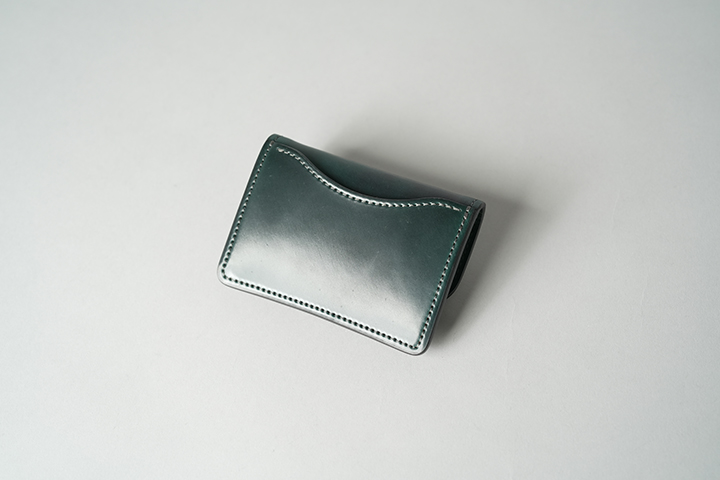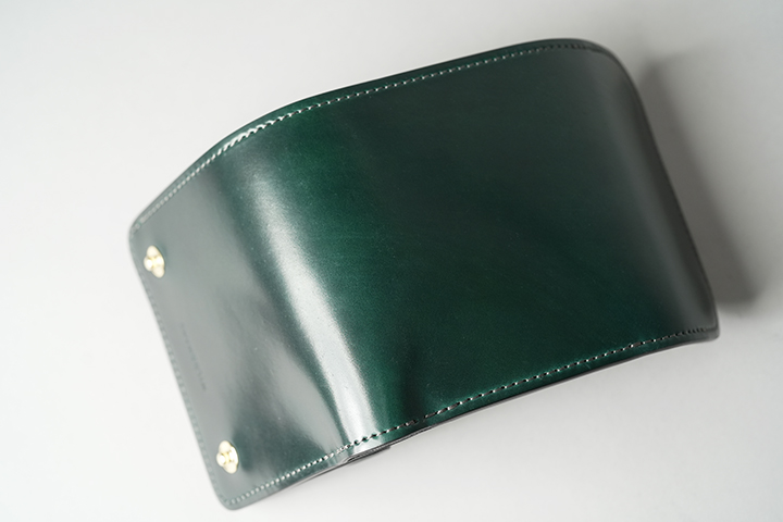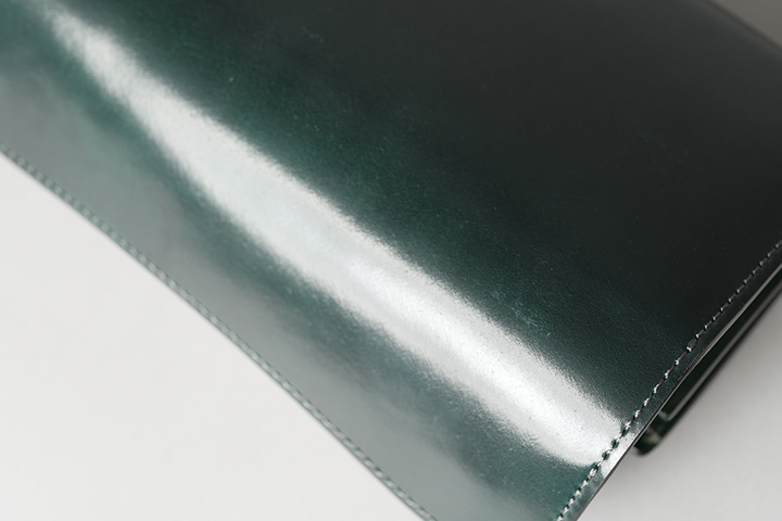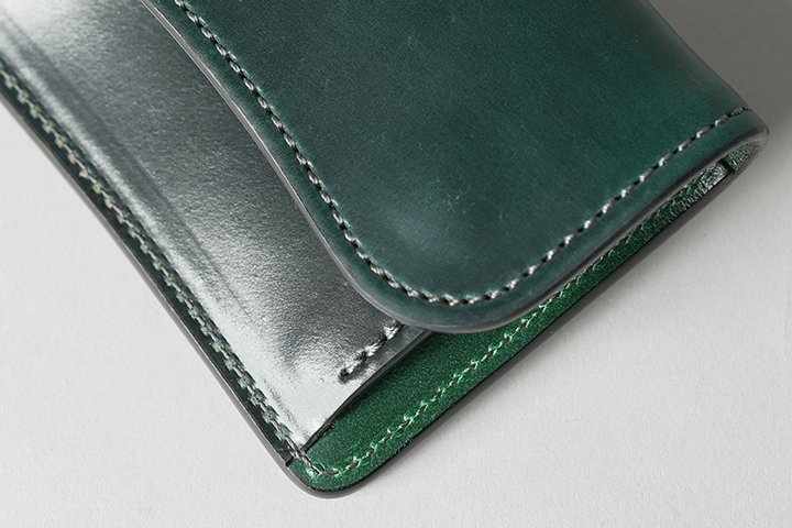 現在、残念ながらグリーンのシェルコードバンのエイジングサンプルのご用意はありません。そこでかなり色味は異なりますが、艶感の変化だけでもご確認頂くために画像上のエイジングサンプルをご用意しました。モデルは多機能コインケースのTONGUE(タング)、シェルコードバンのカラーはナチュラルです。個体差や部位にもよりますが、シェルコードバンは使用前から何処かしらに強い艶があることが多い皮革です。そして、こちらの艶は使用することで更に鋭さを増します。エイジングサンプルも使用から2年が経過して、艶に鋭さが加わりました。
