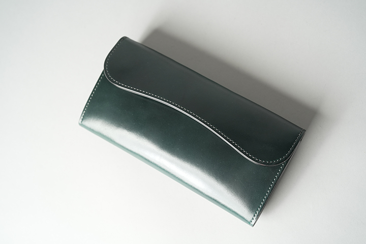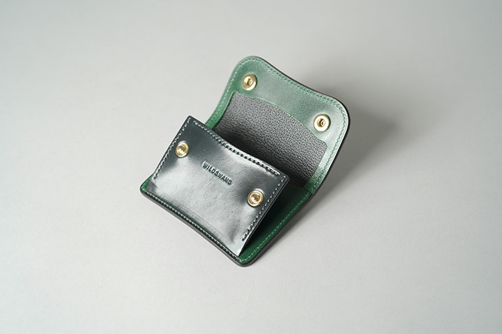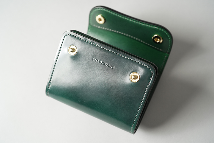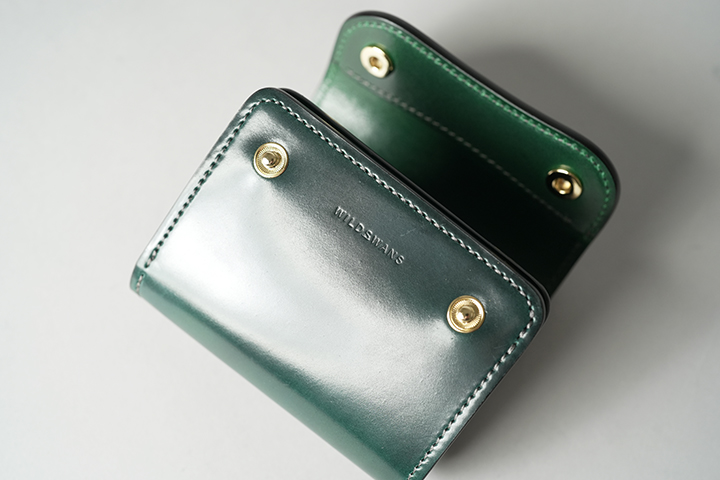 WILDSWANSのウォレットで最大級の大きさを誇るWAVE。外装のシェルコードバングリーンの迫力もこれまでのアイテムとは比較になりません。