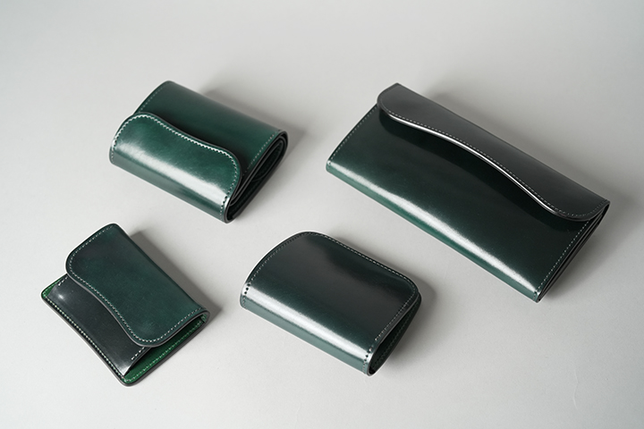今回はこの異なる2つのグリーンの皮革を組み合わせて、特別なアイテムを製作しました。WILDSWANSでは初めて製作する組み合わせとなりますが、同系色ならではの絶妙なコントラストが光る興味深い仕上がりとなりました。また、シェルコードバン、サドルプルアップ共にエイジングを遂げるタンニン鞣し革であることから、使用することで艶感や色味の変化もお楽しみ頂けます。次に今回のシリーズのラインナップをご紹介します。