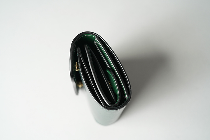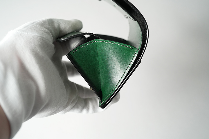 本体を側面から覗くと、内部にグリーンの革がぎっしりと詰められています。