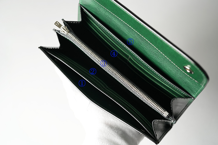 ① 、⑤・・・マチなし収納スペース。紙幣や領収書などの収納を想定。