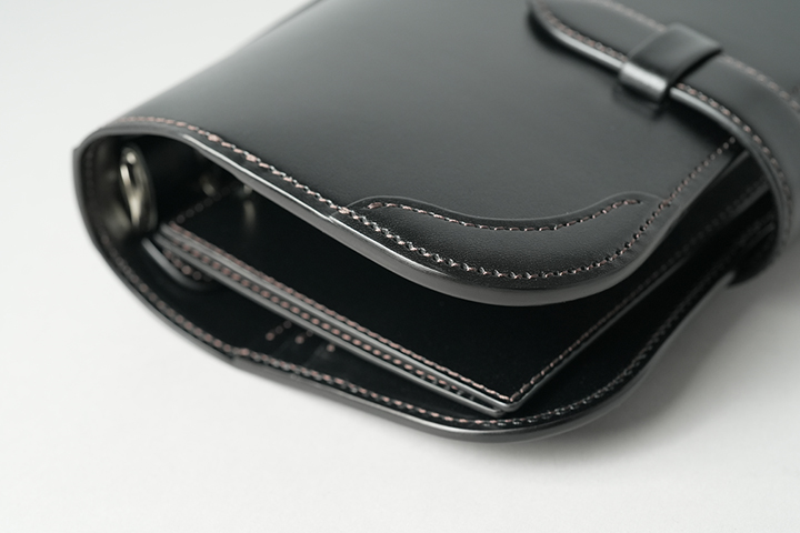 内装の側面は扇型のマチになります。こちらは3連のマチですが、いずれも外装と同じサドルプルアップで製作されています。