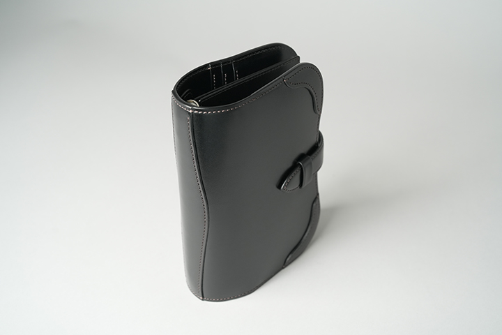 こちらがBIBLEをサイドから覗いた画像です。外装の分厚いコバ(=革の裁断面)と内部の革のパーツにより、重戦車のような出で立ちです。