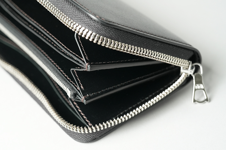 ③ ・・・・コインケースは片マチ構造です。ファスナー、外装と同じトップファスナーです。