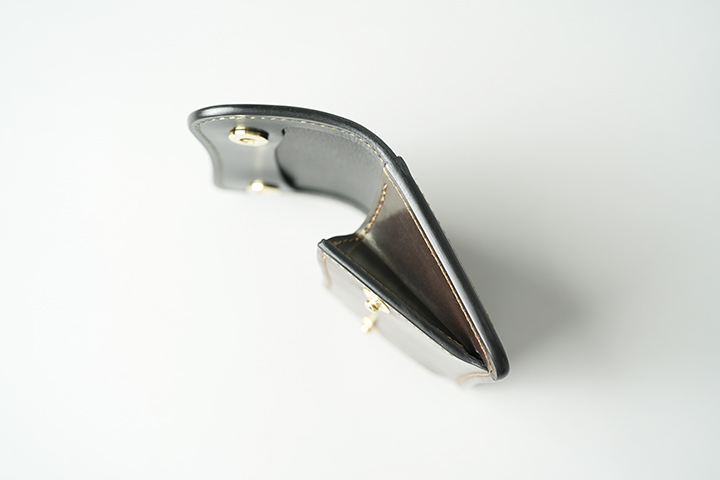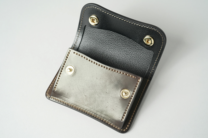 コインケースの内部にはTONGUEのような革の仕切りを設けています。またPALM-V2も両側にマチを備えることで、コインやカードの収納量によりこちらが伸縮する仕組みです。