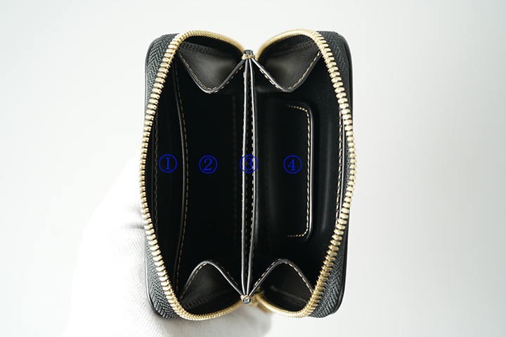 メイン収納の内部には革の仕切りを設けていますので、コインを前身側に入れて仕切りの奥にカードや折りたたんだ紙幣を収納することができます。この仕切りにうっすら光るゴールドの刻印をご覧頂けますでしょうか。先ほどのブランドロゴは、この仕切りに刻印されています。
