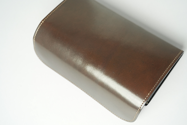 前回の#4に引き続き、今回のシリーズでも内装にはサドルプルアップのブラックを組み合わせています。そして、糸色にライトブラウンのステッチを採用しています。この糸使いによって、外装のダークコニャックとは同系統の色合いで控えめで落ち着いた印象なのに対し、内装のブラックでは一転してメリハリの効いたビビッドな表情を形成します。また、ロゴにゴールドカラーの箔押し、さらに全てのアイテム共通で金具にもゴールドカラーのパーツを採用しています。限定アイテムならではの特別な仕様により、高級感が漂うアイテムに仕上がりました。続いてラインナップのご紹介です。