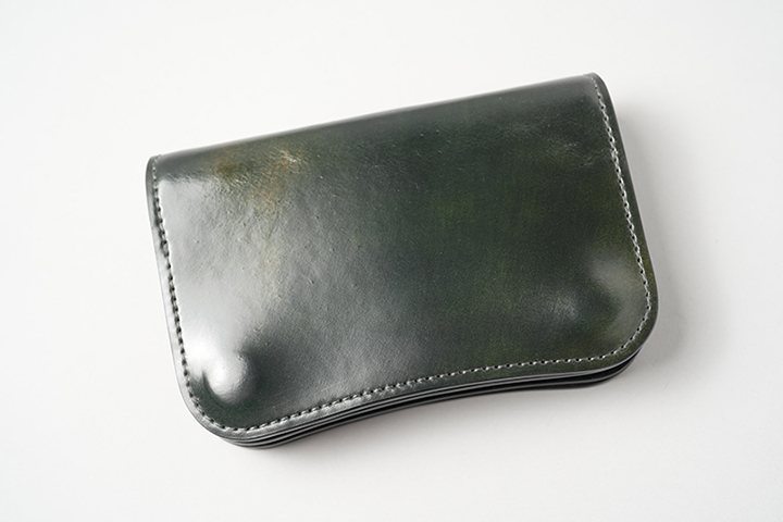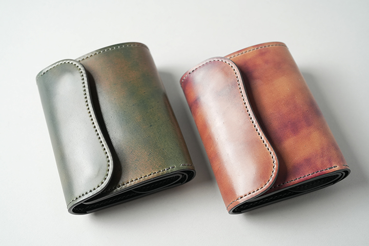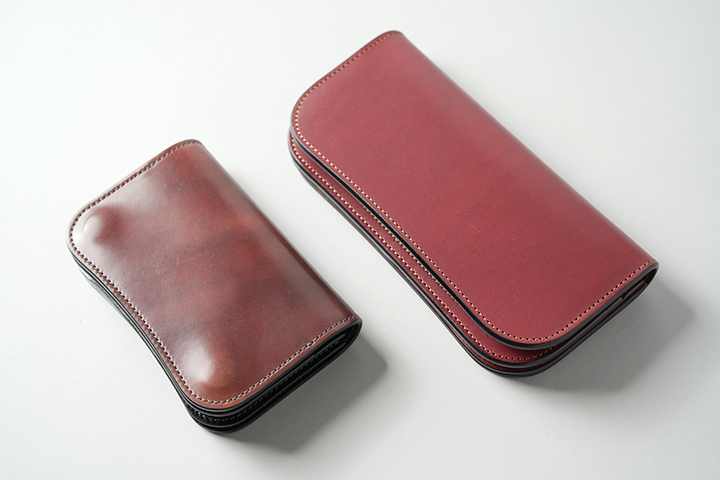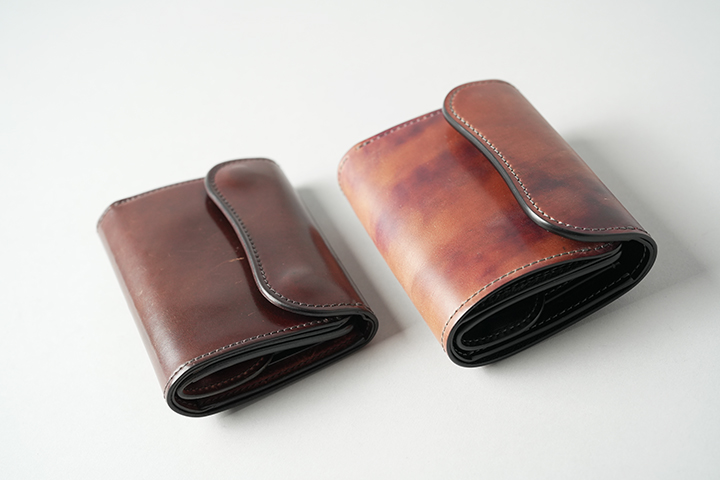 新品時に感じるコロンとした膨らみは、使用を重ねるにつれ落ち着きます。画像左はスタッフが約1年使用したシェルコードバン/#8のENOです。画像右には、今回発売するシェルコードバンマーブル/#8のENOを並べています。革の種類や使用環境によって変化の度合いは異なりますが、使い込むことでより携帯性が高まることが分かります。