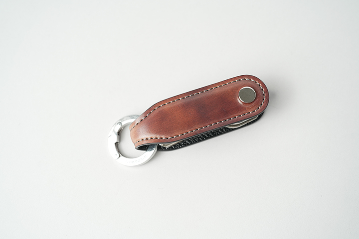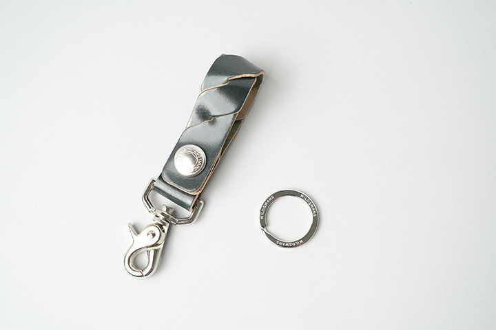 折り曲げ部分は、本体よりも幅をやや狭めることで、金具の取り付けに適した形状にしています。WILDSWANSのカラビナキーリング(画像のLサイズまたはMサイズに対応)を取り付けることで、携帯性が高まります。