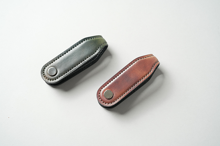 独特のアイデアが取り入れられた、新しいかたちの小型キーケースです。カギを包み込むように収納する一般的な仕様ではなく、革パーツでカギをサンドするようなイメージでお使いいただきます。