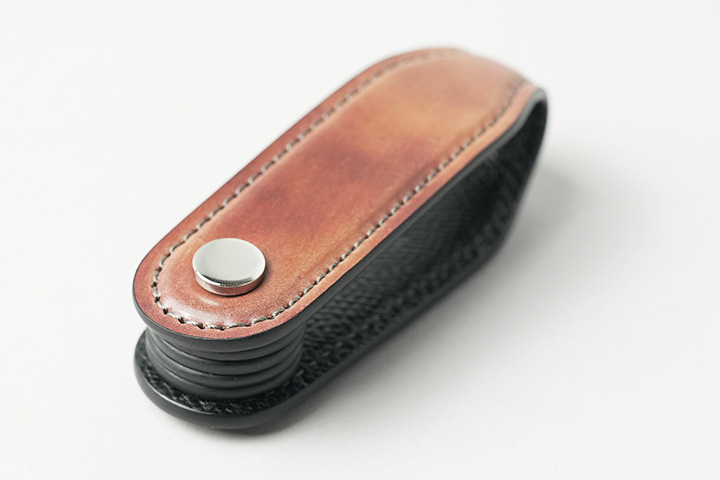 スライサーは、本体の内側と同様に型押しサドルプルアップのブラックで製作しています。画像のように、カギとスライサーを交互に挟むようにして装着し、最後に留め具のネジを締めて完成です。カギの枚数によって、スライサーの量や配置を調整してお使いください。