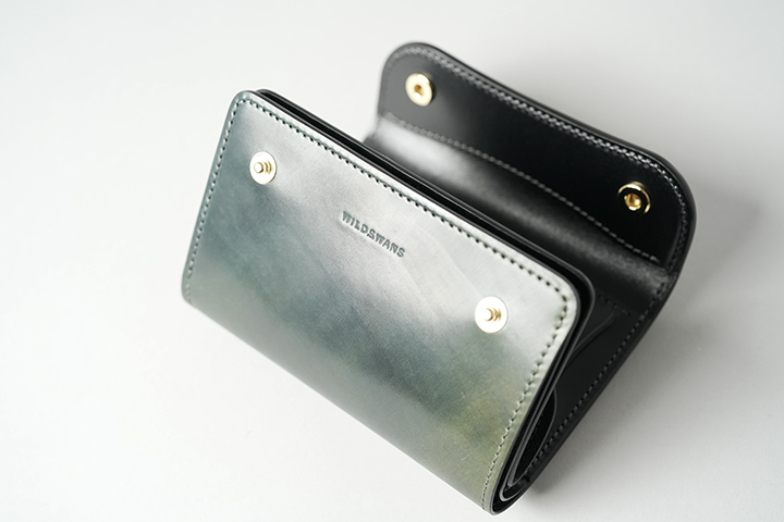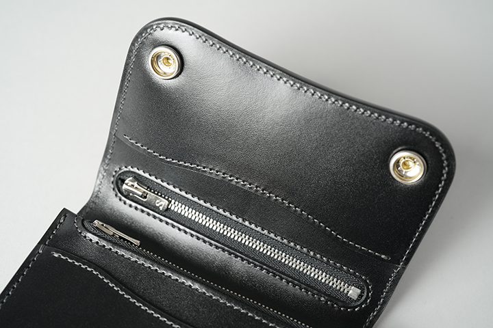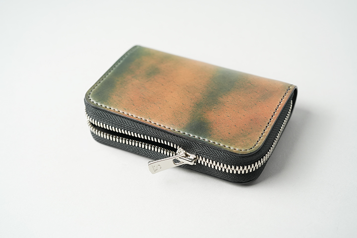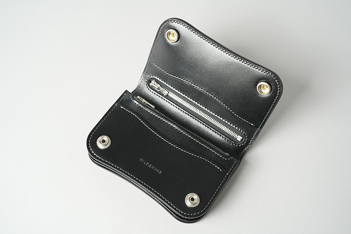 外周のファスナーにはYKK社のエクセラを使用し、滑らかな使用感と高い耐久性を実現しています。引手にはWILDSWANSのロゴがさりげなくあしらわれ、鋭く光るシルバーカラーが全体の雰囲気を引き締めます。