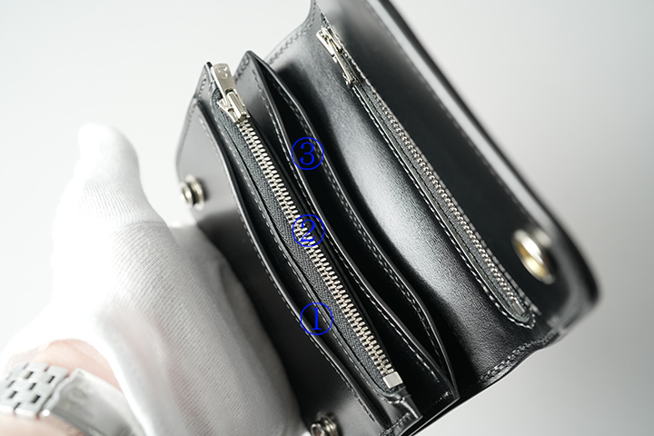 ファスナーを開けると、機能と形状が異なる4つの収納部が露わになります。 ③のマチ無しポケットを境に、 ②と④のメインスペースと、 ①のマチ無しポケットが設けられています。 タイトな空間からマチ式のメインスペース、ベロパーツ(革の仕切り)に至るまで備わっていますので、収納に際して非常に応用が利くアイテムです。