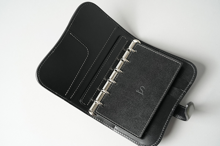 いよいよ内装を見てみます。中央にはバインダー金具が取り付けられ、その金具の隣にはあたり防止の革パーツを備えています。金具一つとっても、細部まで妥協しないこだわりがうかがい知れます。