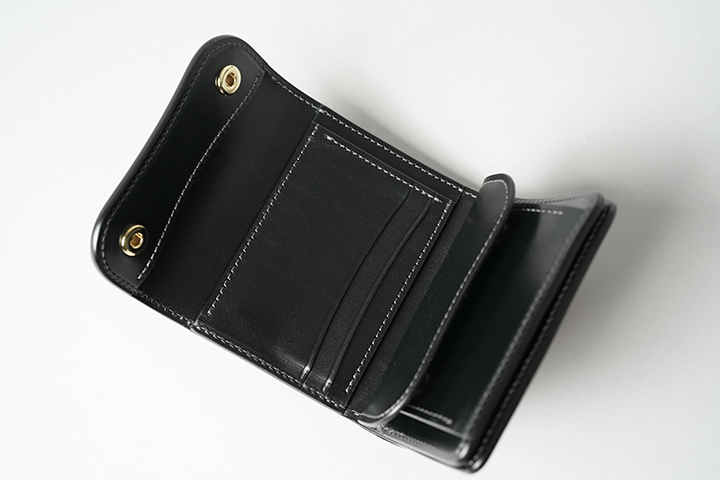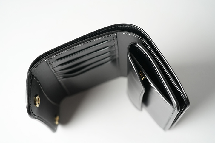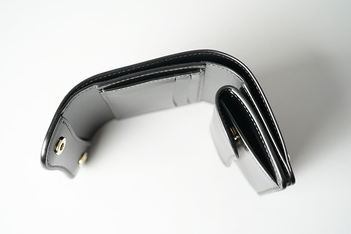 外装を留める2つのホックを解除すると、黒々とした内装が姿を現します。中央にはカード収納部、下部にはコインケースが備わっています。