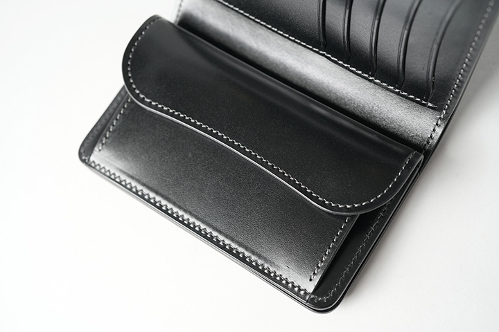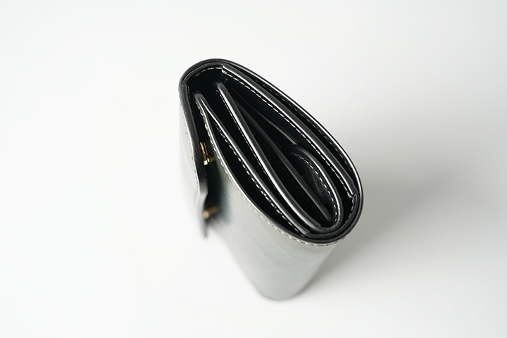 三つ折り財布の板面を活かし、札室はゆったりとした設計です。紙幣やレシートの出し入れも円滑に行えます。