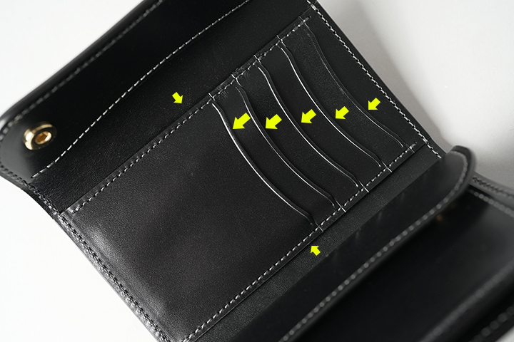 ③のマチ無しポケットはしっかりと深さが確保され、二つ折りの紙幣が収まるのが嬉しいポイントです。