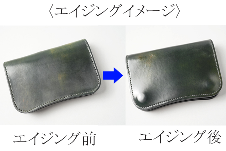 前回のNEWSでもご紹介したブラックのマーブルシェルコードバンのエイジングイメージ画像を改めてご紹介します。画像左の曇りが消えた画像右では色味が濃く変化しつつ、全体に透明感のある艶が出現しているのがお分かり頂けるかと思います。実はこちらのサンプルでは一つのサンプルを使用して背面は無加工、表面には磨き加工を施してエイジングのイメージをしてみました。