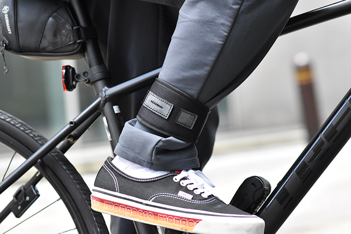 トラウザーズストラップは、ロードバイクやクロスバイクなどチェーンがむき出しの自転車に乗る際に、チェーンの衣類(パンツ)への干渉を防止するために開発されました。チェーンの汚れや巻き込みから衣類を守りながら、アクティブな運転シーンをサポートします。