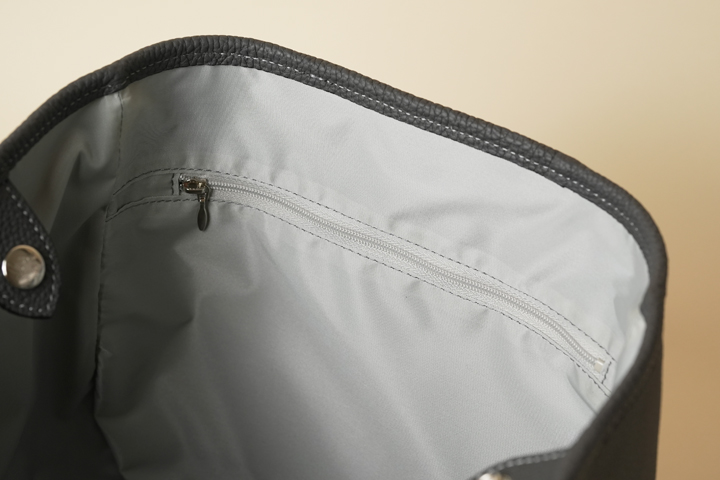 内装の片側にはファスナー式のマチなしポケット(約H14×W18cm)が取り付けられているため、