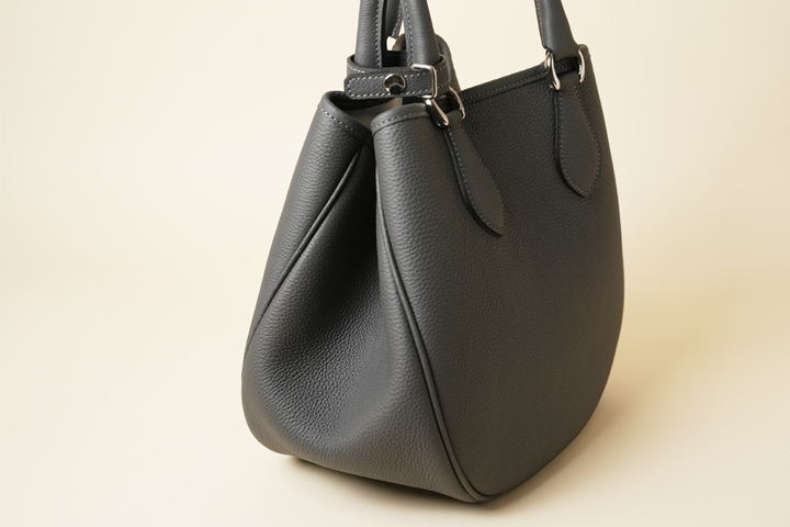 内縫いと弾力のあるシュランケンカーフによってふっくらとしたラインを、また口元をベルトで絞ることで独特の水滴のようなフォルムを形成しています。