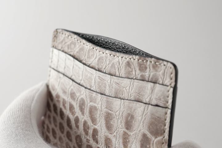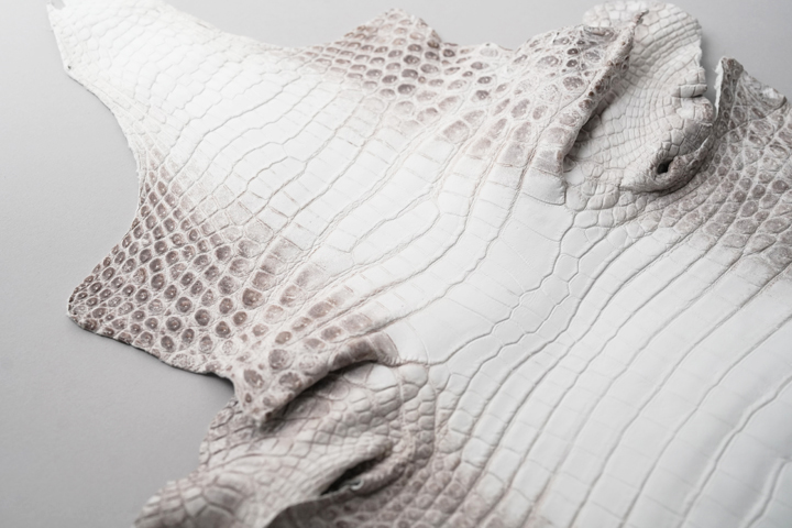 意外に思われるかも知れませんが、ヒマラヤクロコは白い顔料で塗装されたものではなく、皮革の色味を活かして製造されており、染色や塗装は行われていません。 よって原皮の持つ表情がダイレクトに皮革に現れることとなり、厳選した原皮を用いる必要があります。また鞣しの工程も一般的なクロコダイルよりも手間が掛かることによって、その美しさと希少性から高級皮革として珍重されています。