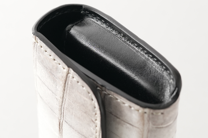 フラップ部分に加え、前身と呼ばれる正面のパーツもクロコダイルを使用しています。 本来のクロコダイルTONGUEの前身には内装の皮革が使われますが、クロコダイルの使用面積を広げた贅沢仕様になっています。