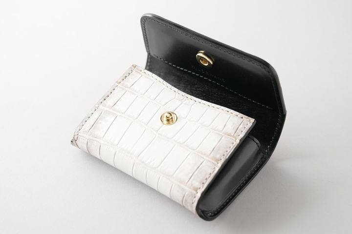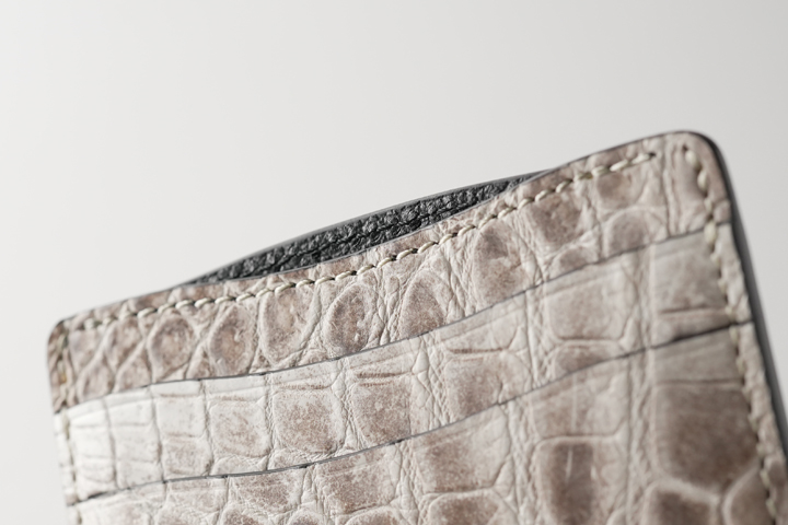 皮革のカラーに合わせた仕様ですが、構造上(表裏が同じ色味の皮革の場合など)クロコダイル部分に黒いステッチで縫製される部分があります。また、部分的に反対側のステッチが見えることがございますこと、予めご了承下さいませ。