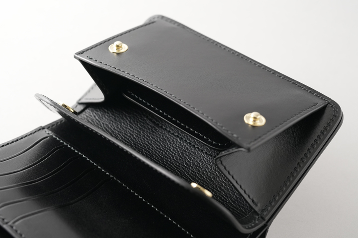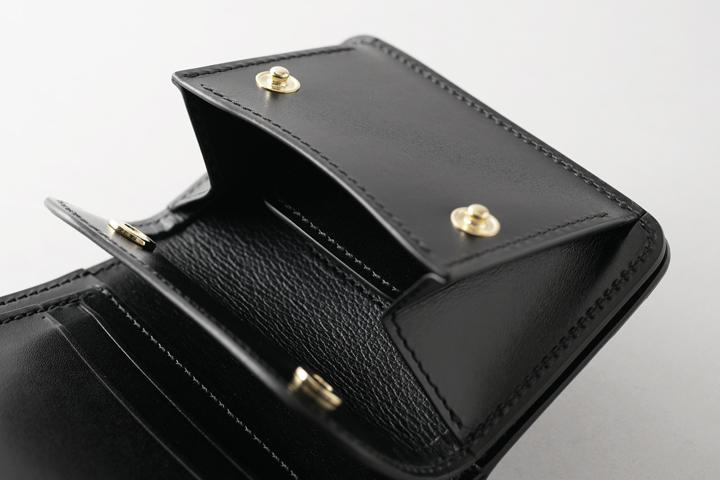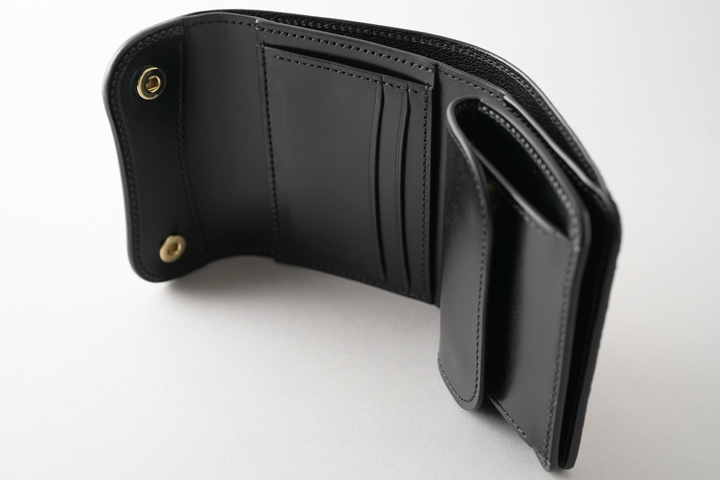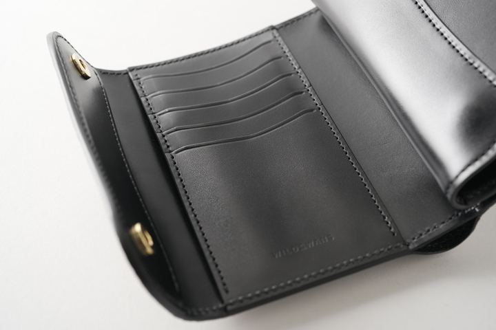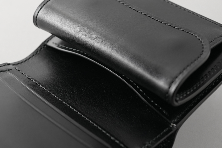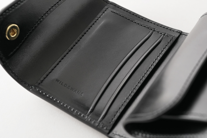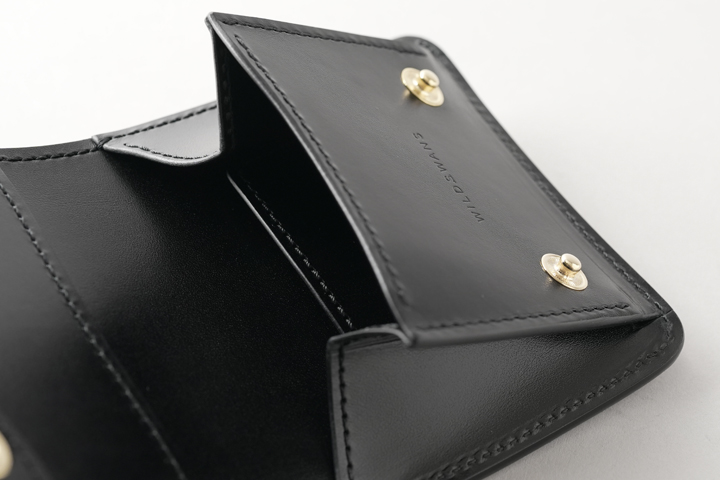 本体のフラップは1点のホックで留められているため、新品状態でフラップが閉じます。 これまでに製作されたWILDSWANSのカードケースはフラップにホックのないモデルが多くありましたが、ARTHURはホックがあることで最初からフラップがしっかりと閉じています。