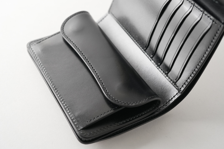 また、コインケースとカードケースは可動式のフラップを境に1つのスペースを共有しているため、フラップを前後に動かすことによってそれぞれの収納量が変化致します。