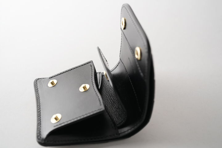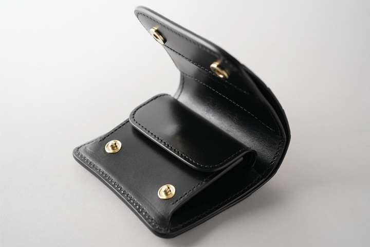 フラップを開けば内装はそのままコインケースになっています。両サイドにはマチが折り畳まれておりますので、ケースは手前に大きく開きます。