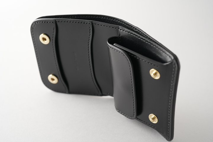 丸みを帯びた愛嬌のある見た目と同時に重厚感や存在感も強く感じる三つ折り財布、収納量は豊富で様々なものを収めて持ち運ぶことが出来ます。