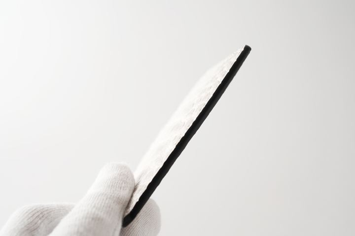 厚さ数mm程度で非常にスリムです。 外周のコバはしっかりと磨き上げられており、薄手でも堅牢な印象です。