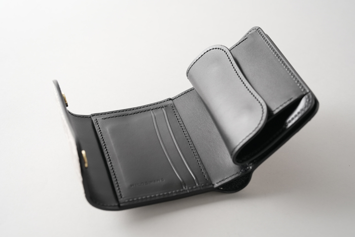 手のひらサイズの三つ折り財布、ENO。コンパクトですが立体的に配された収納部によって収納量も高く、機能的なモデルです。
