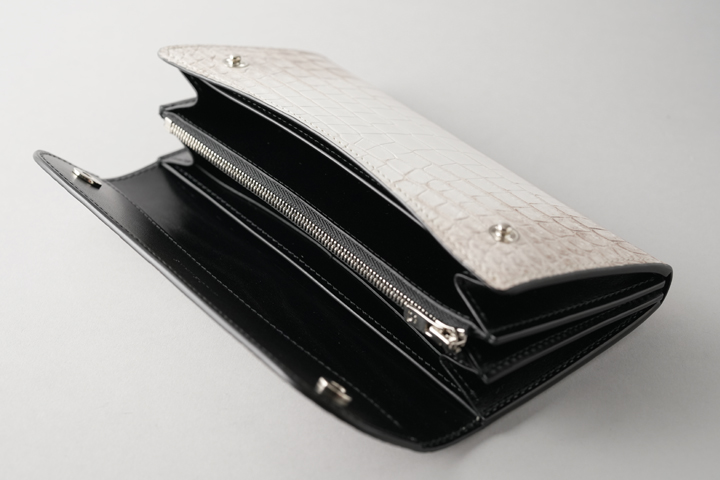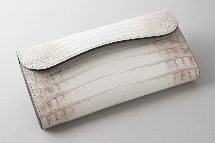 迫力の大型長財布です。全モデルで唯一必ずセンター(腹部中央)を裁断して製作されますので、ヒマラヤクロコの優雅で気高い表情を存分に堪能できます。