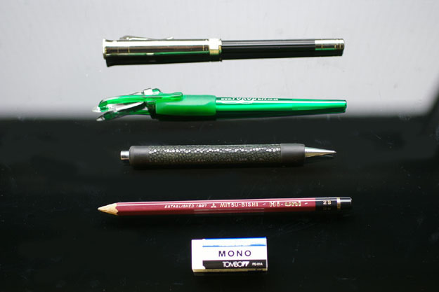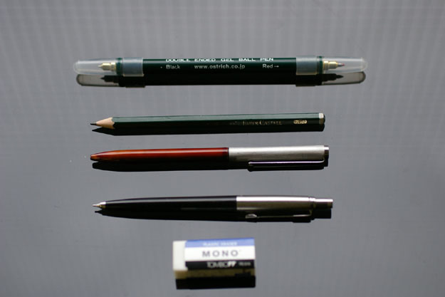 その他、FABER CASTELLのパーフェクトペンシル、YOROPEN、国産のどこかのシャープペンシル(←いい加減・・・。)、三菱の鉛筆、MONO消しゴム(PE-01A)で試すと・・・。