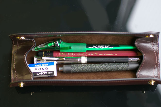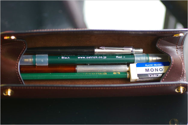 例えばですが、OSTRICHのボールペン、FABER CASTELLの鉛筆、MONTBLANCのボールペン、PARKERのシャープペンシル、MONO消しゴム(PE-01A)を入れてみると・・・。