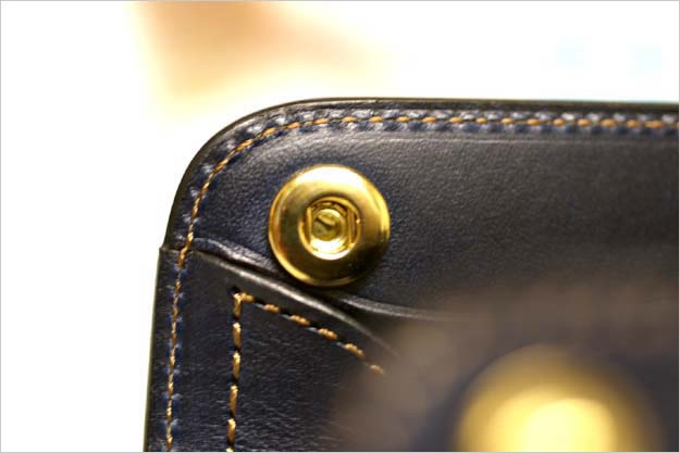 WILDSWANSの、ホックが付いた全ての製品について言えるのですが、開閉方向に対してバネの向きは必ず垂直になるように取り付けてあります。(あまり知られていない部分で、他所のメーカーさんも気にしない箇所ですが、これが結構大事でして、もしバネの向きが斜めになっていたりすると、5年もつホックも3年でダメになったりします。)