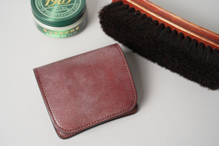 フルグレインブライドルレザーは、革の製造段階で潤沢に脂分とロウ分を染み込ませているため、普段のお手入れではクリームなどをお使い頂く必要はございません。馬毛ブラシでのブラッシングや、クロスでの乾拭きを行うのみで表面の汚れの除去や、ツヤ出し、革のエイジングを進めることができます。お使い頂く中で革の乾燥が感じられましたら無色の皮革用クリームを少量布に取り、満遍なく薄く塗り広げてください。その後ブラッシングをしてクリームを馴染ませ、余分なクリームを除去し、クロスや羊毛グローブで乾拭きを行いましたら完成です。