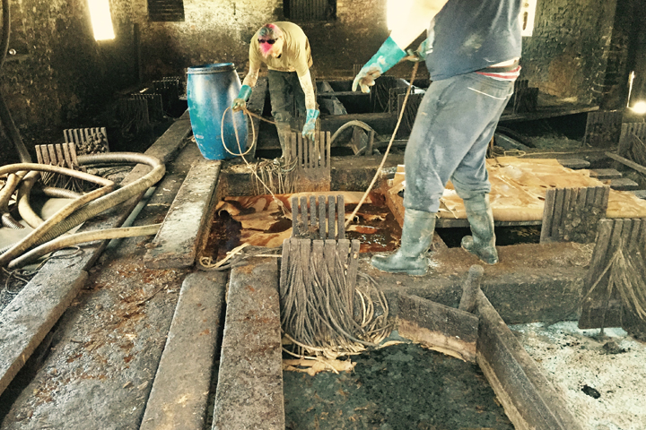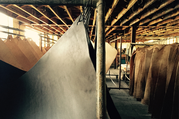 ベイカー社ではオーク樹皮から抽出したタンニン溶液を用い、濃度の異なるタンニン槽に段階的に移し替えながら通算12ヶ月以上もの期間を費やしてじっくりと鞣しを行っています。