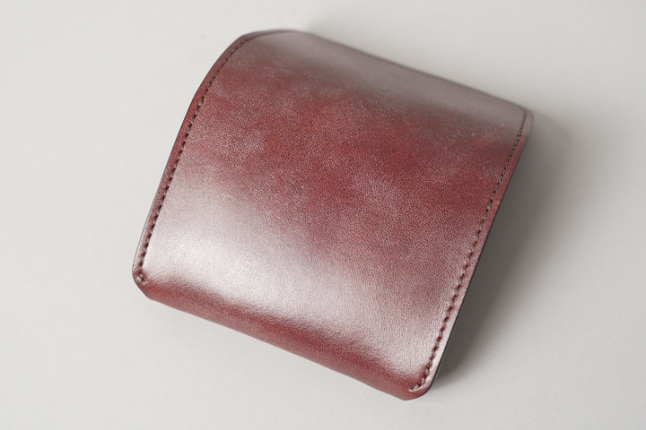 この後にご紹介させていただくコインケースのTONGUEと同程度のサイズ感ですが、大きく見た目が異なるのは背面ポケットの有無です。ARTHURはポケットが備えられておらず、つるんとした背面はフラップ~前胴に繋がっており、丸みを帯びたフォルムを形作っています。