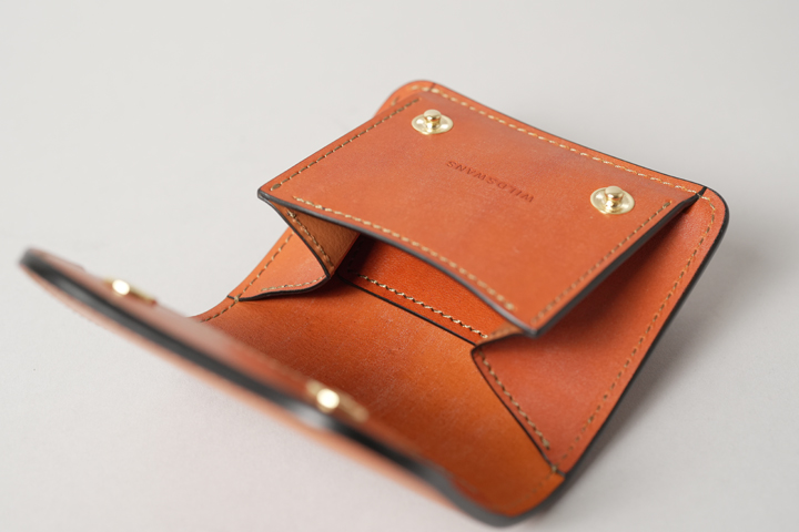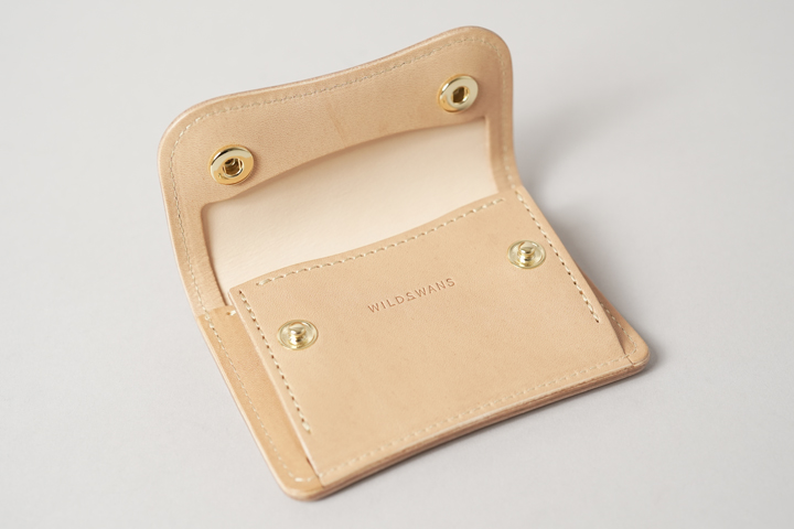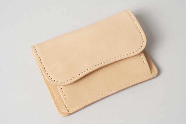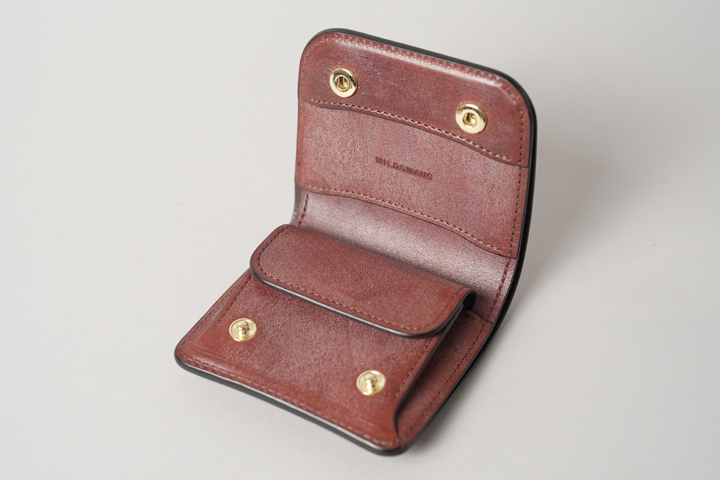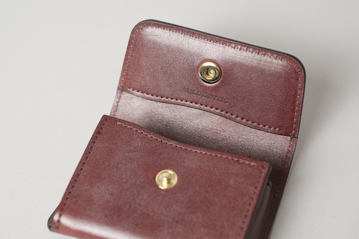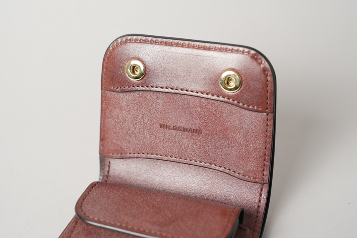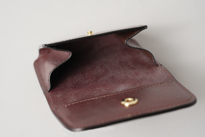 外装は切れ目のない1枚の革パーツで構成されており、フラップを開けば手のひらよりも大きいサイズになり、小型のアイテムながら革の表情を楽しむことができます。