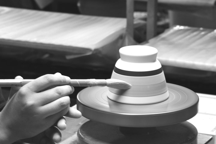 上の画像は深川製磁さんより提供していただいた画像で、伝統的な掛け分け技法による絵付けの様子です。一点一点丁寧に施される極めて繊細な行程です。
