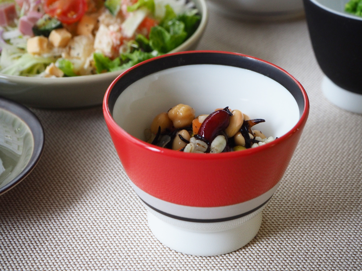 一方、こちらは食卓で小鉢として使用してみた場合です。透き通るような真白な磁器の肌に対して華やかに料理が映えます。