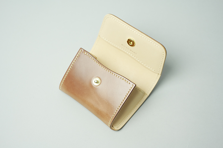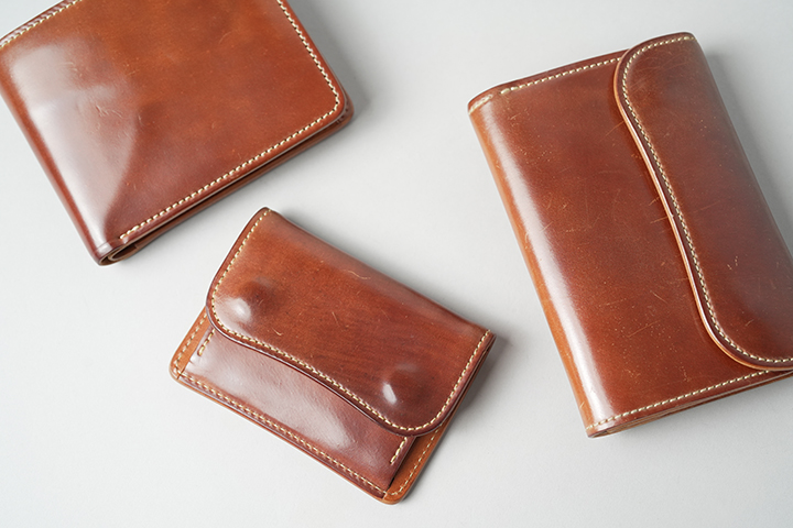 無染色のナチュラルカラーは素材を問わずエイジングの度合いが大きくなりますが、シェルコードバンもまた然りです。画像はスタッフが3年程使用した、シェルコードバン/ナチュラルの二つ折り財布・GROUNDERです。使用前と比べて、明らかに大きな変化が現れています。皮革の色味はこんがりと焼けたように深い褐色に変わり、コードバン特有の鋭い光沢も持ち合わせています。淡く繊細な印象を脱ぎ捨て、まるで異なる素材にも思えるほどの大胆なエイジングこそ、ナチュラルカラーの醍醐味です。