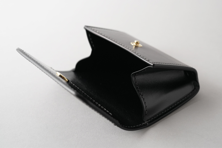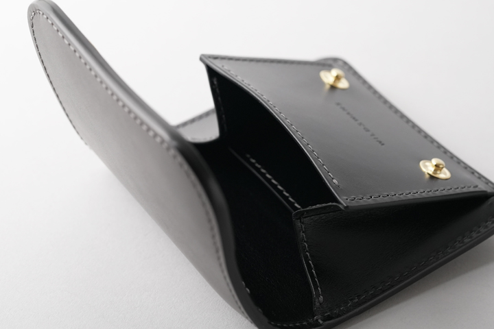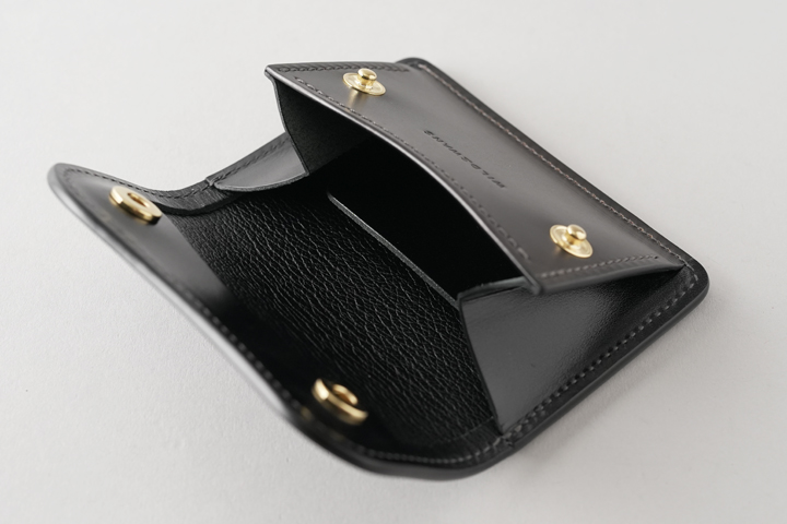 コインケースのフラップはホック1点で留められ、内部は仕切りパーツのない1室構造になっています。