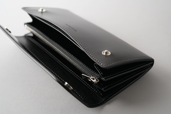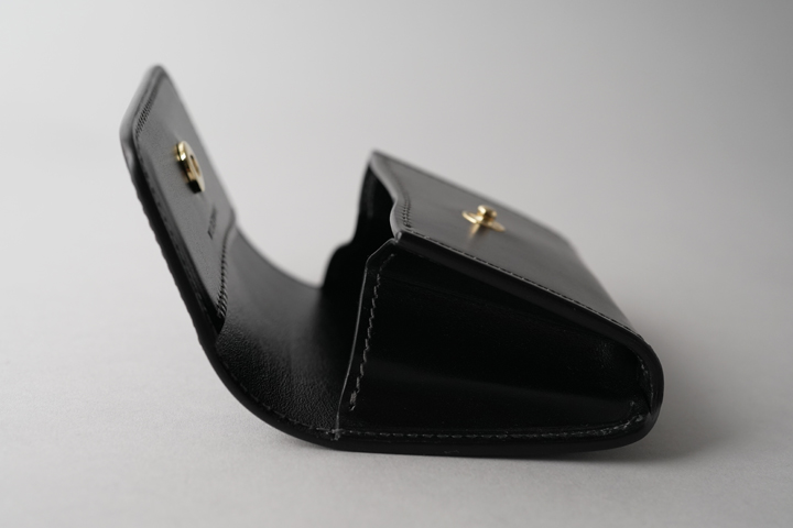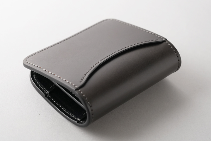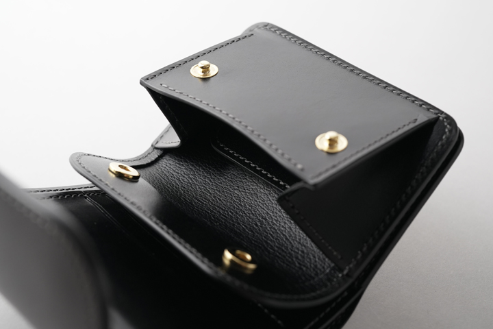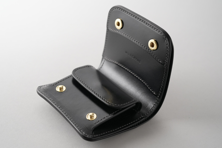 カード収納部の隣にはコインケースが取り付けられています。 フラップ式のコインケースは横長で、コインの収納枚数が増えても厚みが出にくい構造です。