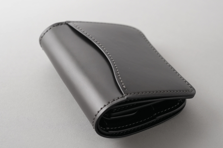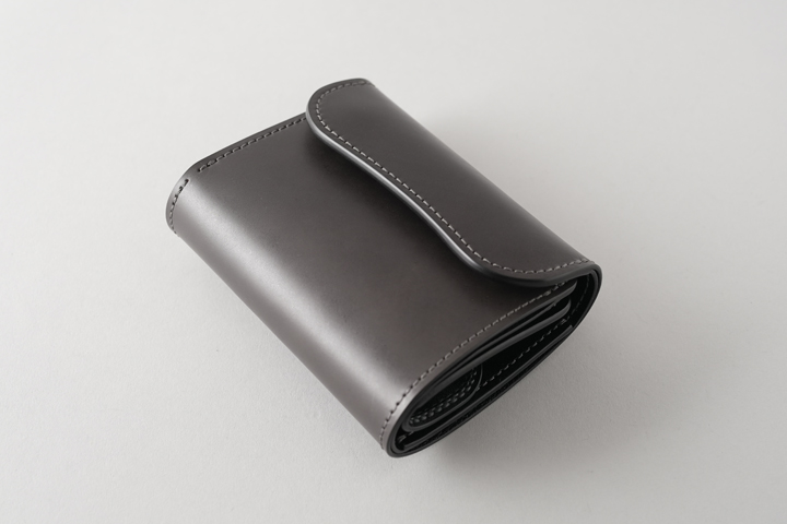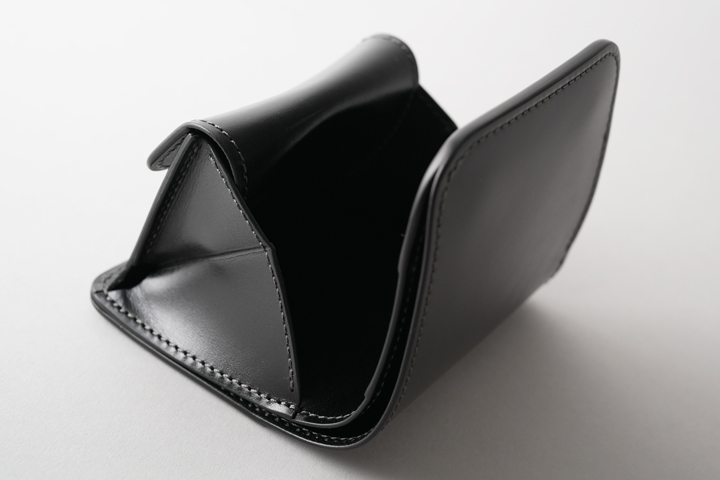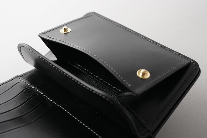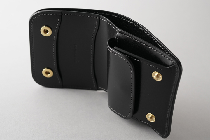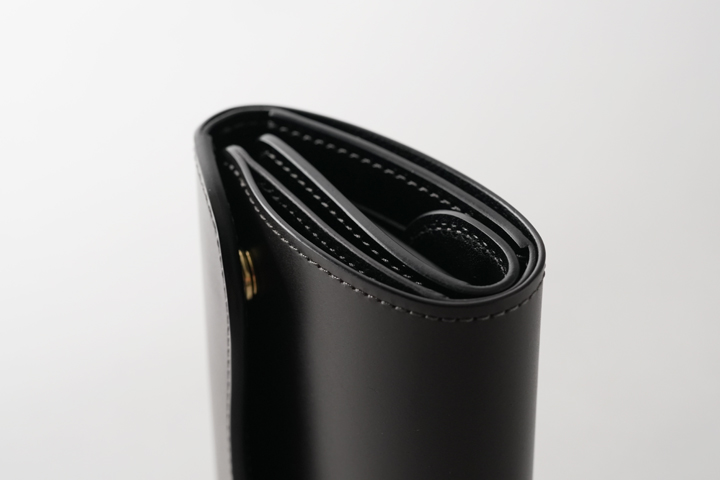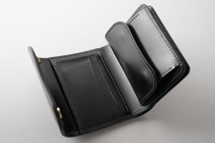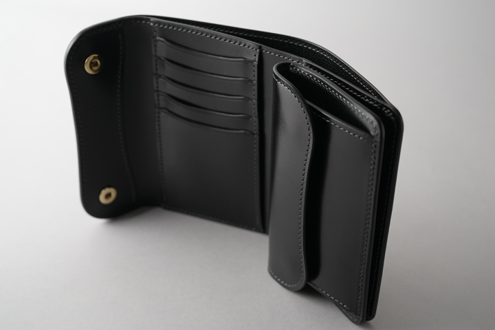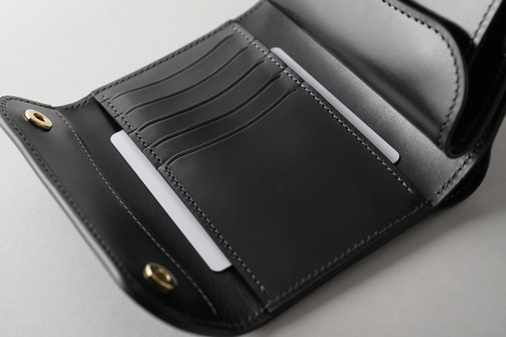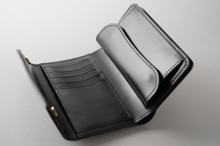立体的に収納部を配置し、小さいながらも豊富な収納量を備えた三つ折り財布です。