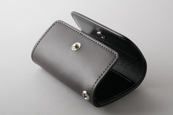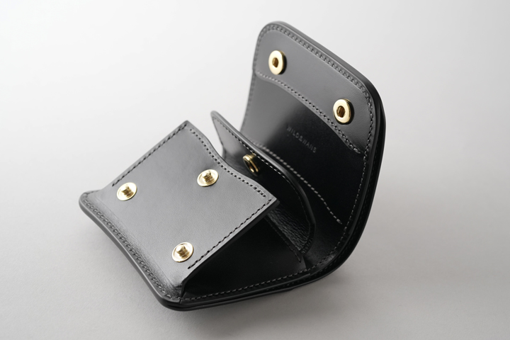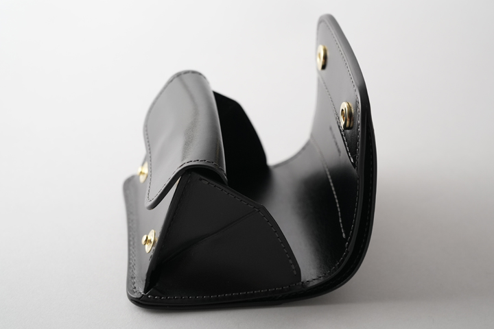 こちらはコインケースです。フラップ式のコインケースはカード収納部に対して垂直に取り付けられています。
